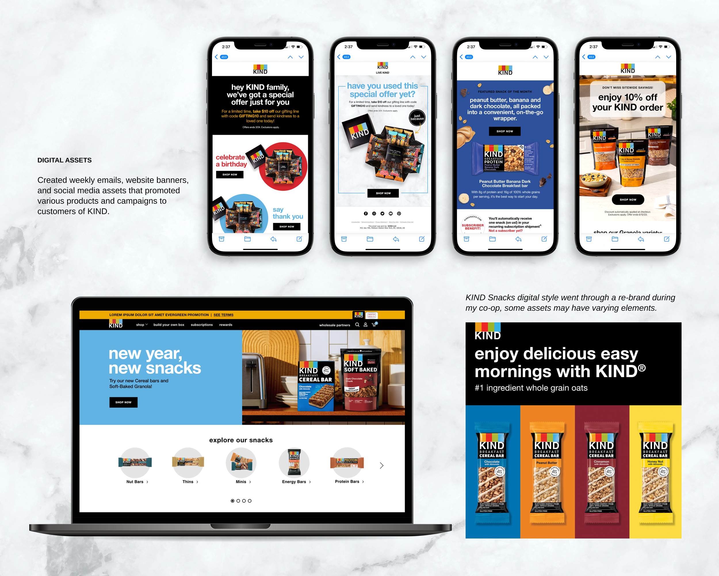 During my time as a Spring 2023 co-op at KIND Snacks, I was part of both the Print Design and Digital Design teams where I created e-commerce creatives, updated brand assets, and managed multiple design requests in a timely manner.
