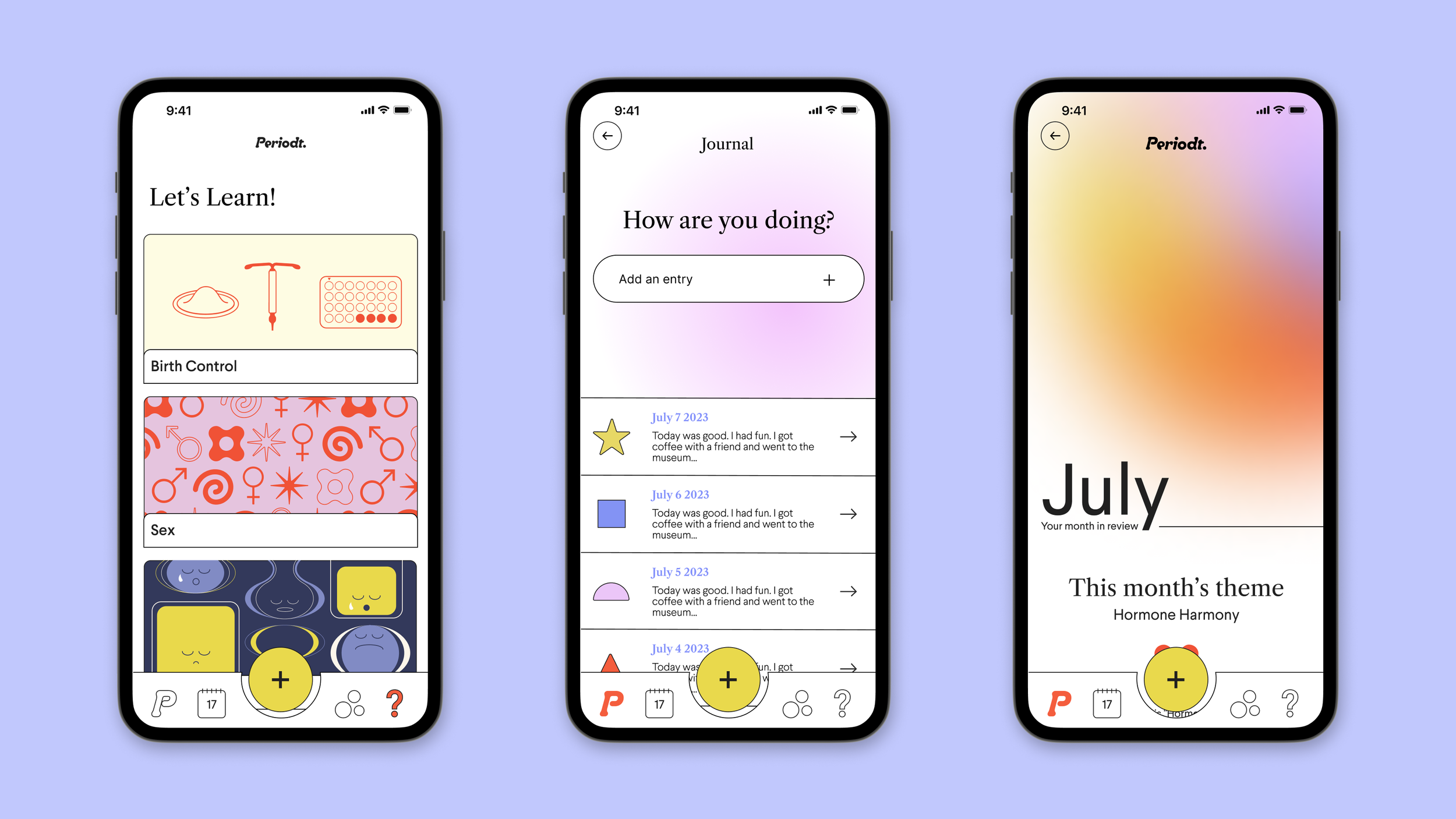 Periodt. provides a safe space for users to learn about their cycle, track their mood and symptoms, and journal daily.