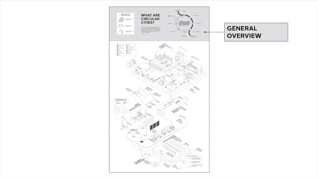 Conducted extensive research into the concept of circular cities and its meaning to understand the topic better. I decided to organize this research in a few ways to better understand how to frame my hierarchy for the infographic.