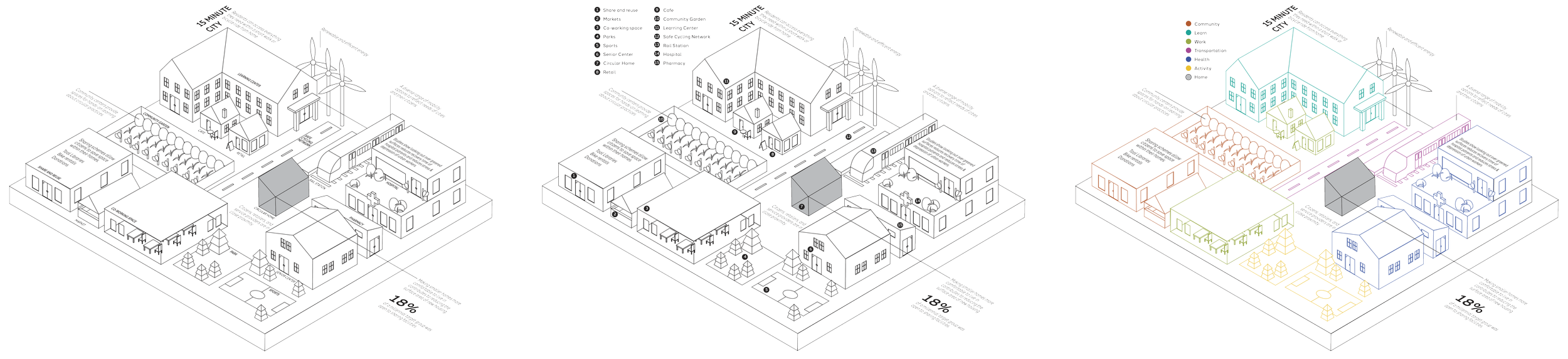 Using an isometric grid, I iterated ways to organize visual cues within sections of the poster and drew everything at an isometric angle to communicate the idea that this is a layout or blue-print for what a perfect circular city may look like.