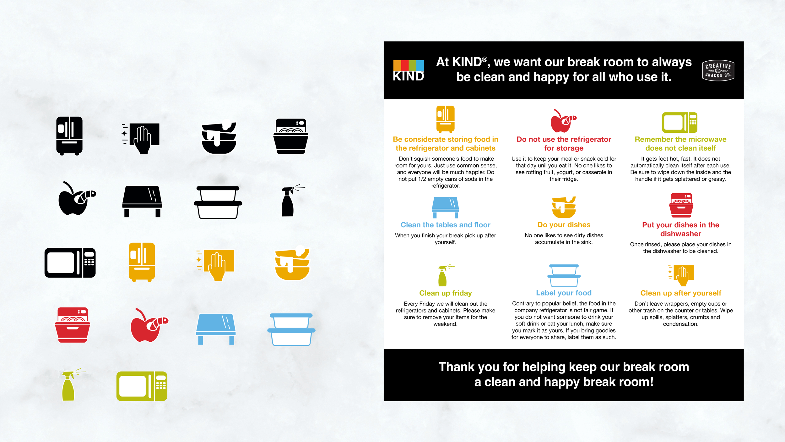 Designed a set of icons and signage for one of KIND’s offices to streamline the branding throughout the company.